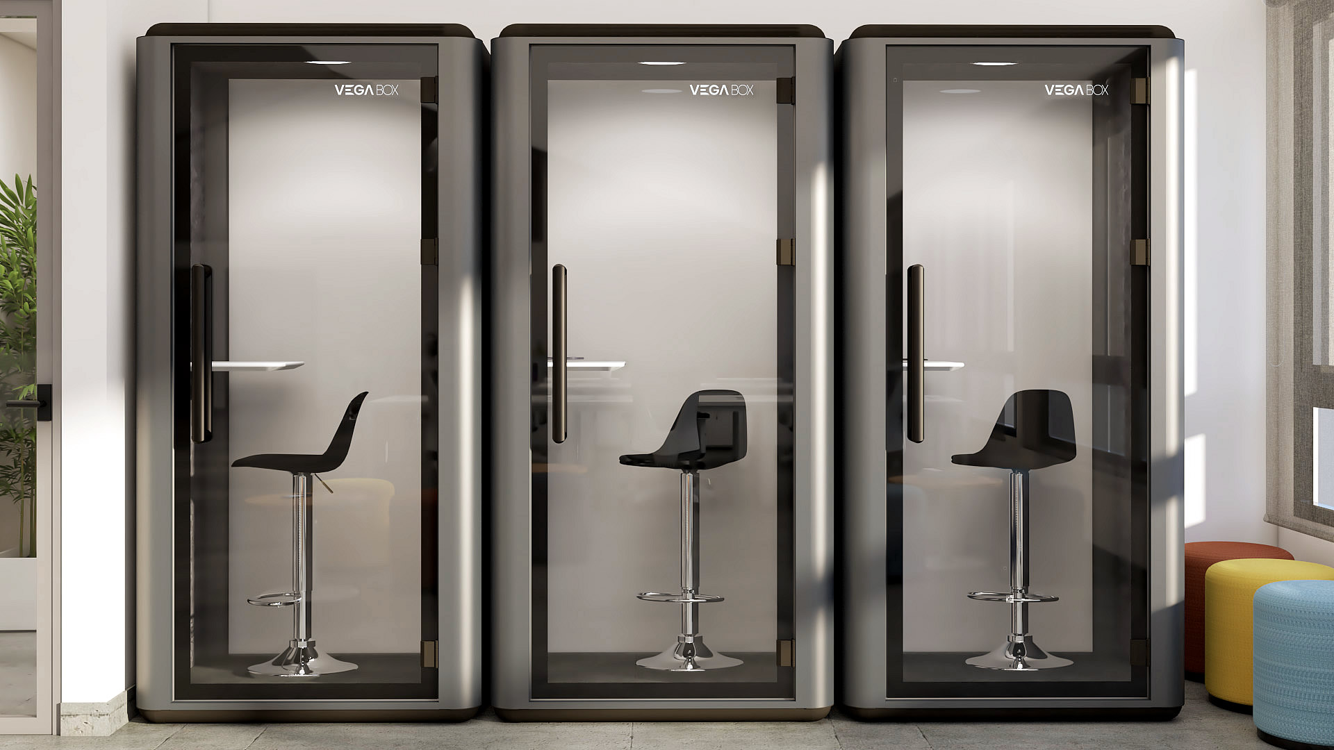 VEGA ofrece un espacio tranquilo para realizar llamadas telefónicas importantes o trabajar en tareas que requieren concentración. Completamente equipada con todos los accesorios que puedas necesitar, diseño de última generación de aspecto moderno, muy funcional, se adapta a cualquier entorno y es más económica que la mayoría de cabinas telefónicas del mercado.